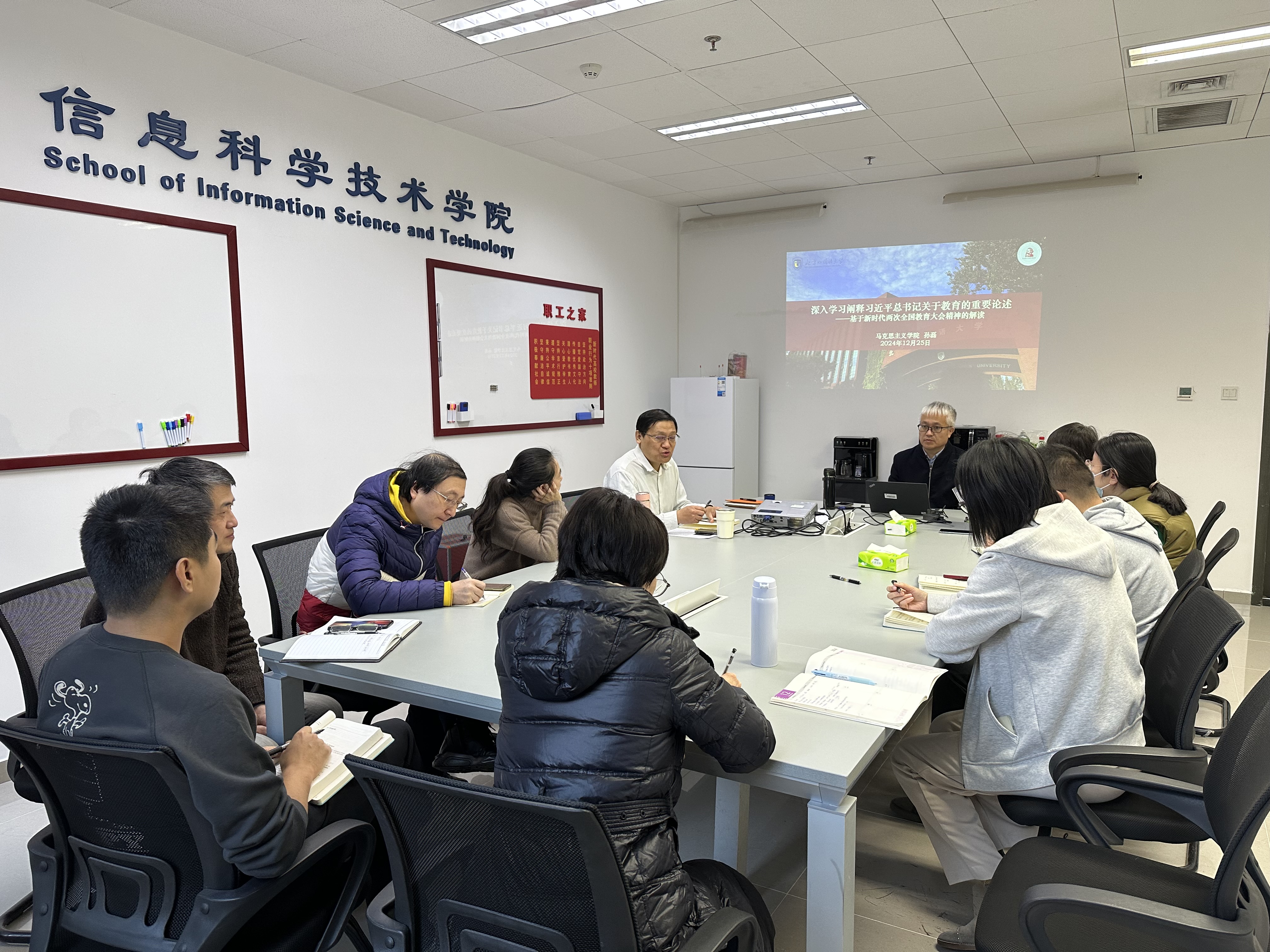 2024年12月25日上午,beat365英国官网网站召开2024年度第十次全体教师集体学习,邀请马克思主义学院孙磊老师做《深入学习阐释习近平总书记关于教育的重要论述——基于新时代两次全国教育大会精神的解读》报告,学习会由学院党总支书记梁野主持,全体教职工参加学习会。孙磊老师首先对比分析了2018年和2024年两次全国教育大会的篇章结构与内容,细致阐述了两次大会的异同点,详细解读了两次大会的核心主题“坚持中国特色社会主义教育发展道路 ...