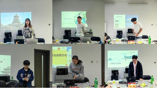 各民族学生代表先后就本民族特色文化进行分享。侗族代表王孝媛分享了民族服饰侗布、语言文学、建筑及饮食,展现了人与自然和谐共处的智慧,并以侗语俗语“山高比不过人的志气高”大家共勉。穿青人代表周健揭秘其称谓、分布、信仰及婚丧习俗,强调穿青人在现代化中坚持文化传承与创新的平衡。壮族同学韦凯良、黄梓瑜、卢茜分别展示了壮语、服饰、节日及非物质文化遗产,如三月三歌节与织棉绣球,彰显壮族文化的多彩与融合藏族代表洛桑扎杰从藏民族起源讲起,介绍了藏文藏语的独特魅力及其在现代化中的保护与传承,同时分享了宗教信仰与生活方式的现代融合。土家族姚源瀚、吴小乐、冉一洲则展示了土家族蛊术、婚丧习俗及饮食文化。大家就各民族独特的文化习俗展开热烈讨论。