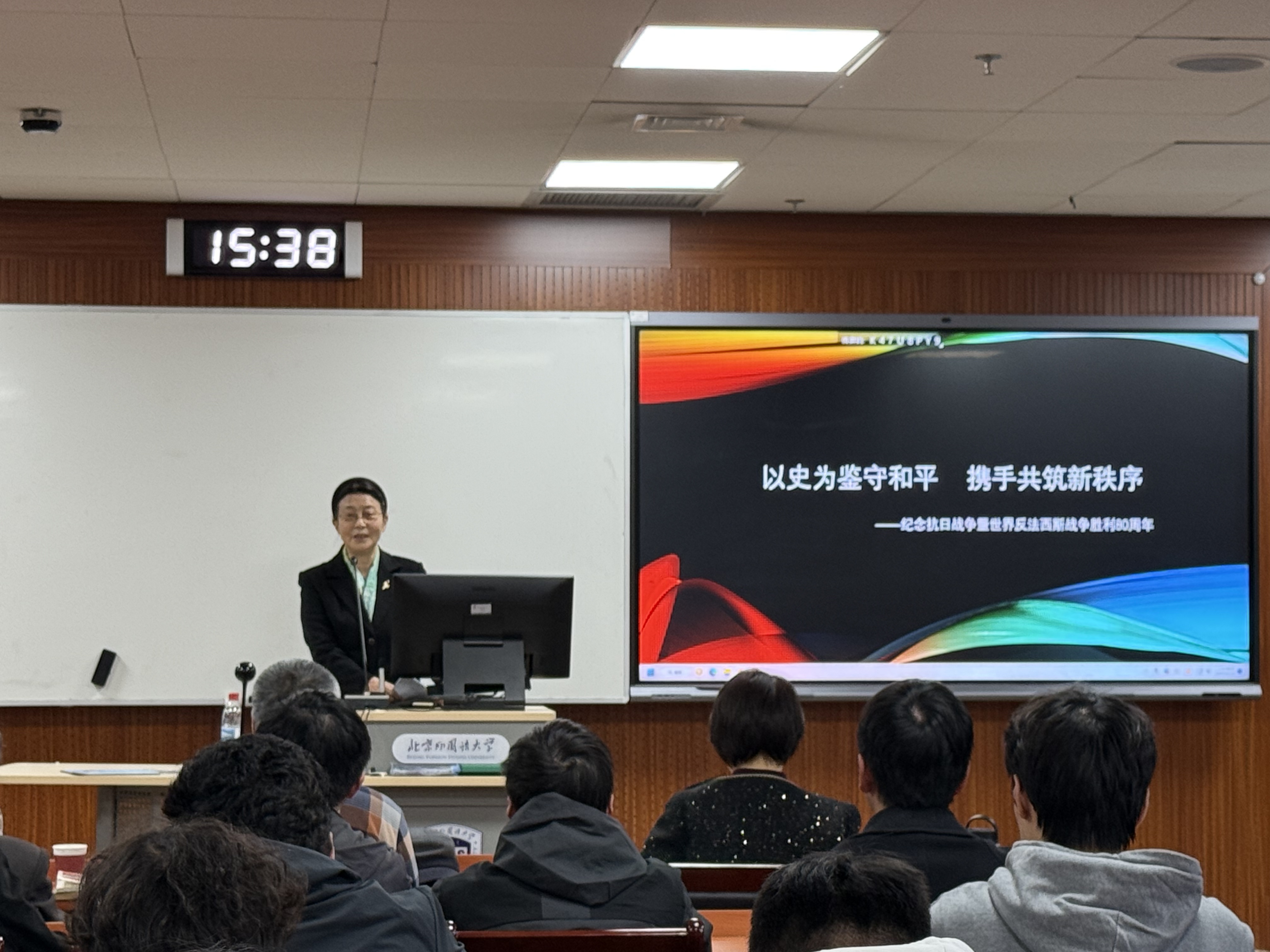 报告会伊始,裴玉芳老师以“二战战场全景与历史启示”为题,系统梳理了斯大林格勒保卫战、莫斯科保卫战等西方战场的重大战役,以及淞沪会战、台儿庄战役、百团大战等东方战场的关键会战,深入剖析了其战略意义与历史价值。她特别强调,中国共产党在抗日战争中发挥了中流砥柱的作用,推动建立抗日民族统一战线,领导敌后根据地建设,为抗战胜利作出不可磨灭的贡献。裴老师指出,青年一代应从中汲取历史智慧,坚定战略定力,珍视并维护世界和平。