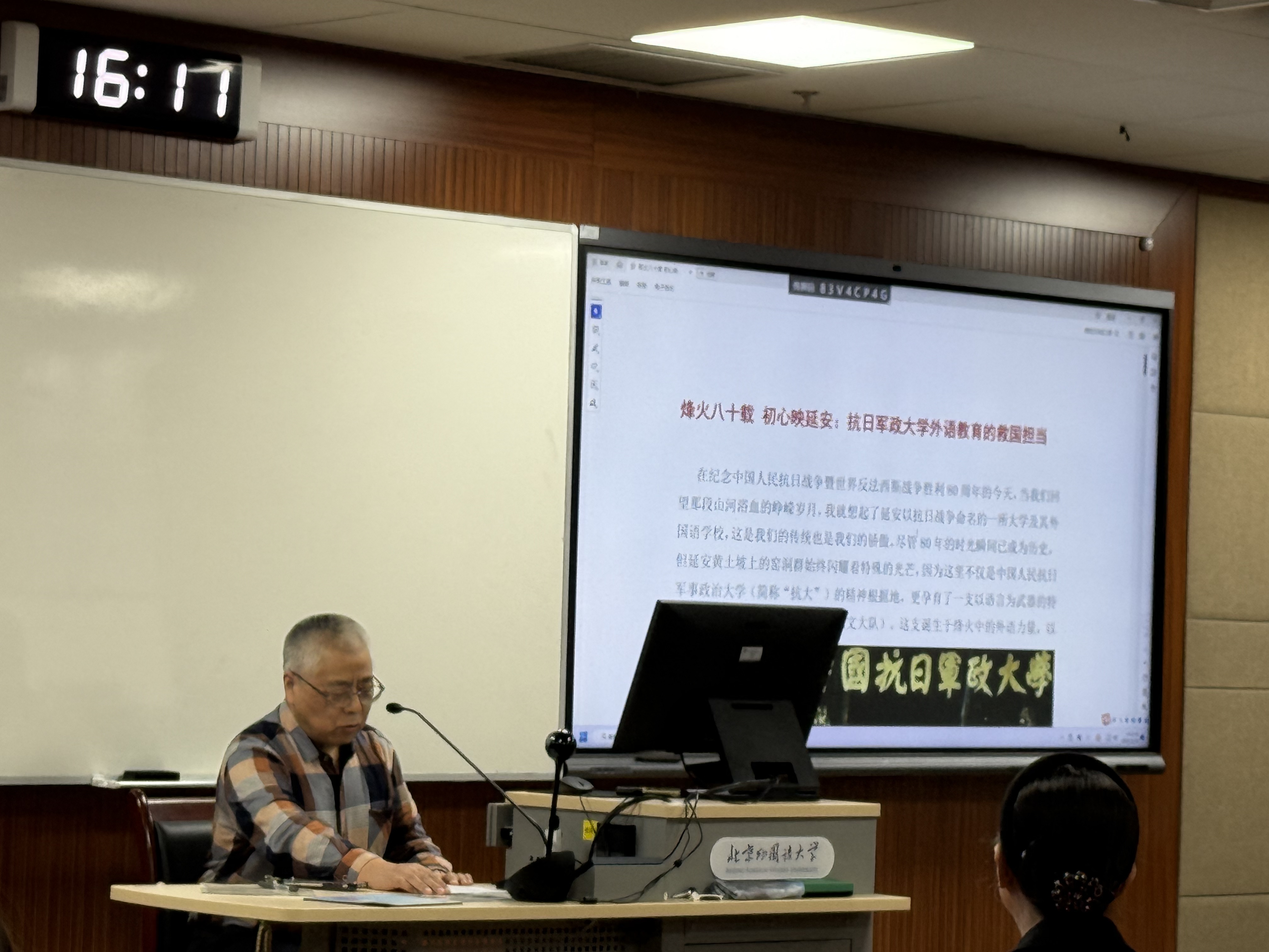 随后,吕才老师围绕“抗日军政大学外语教育的救国担当”展开讲述。他从抗大创办的历史背景出发,介绍了其“战时为兵、闲时为学”的办学特色与人员组成,回顾了毛泽东等老一辈革命家对学校的关心与指导。吕老师指出,抗大不仅培养了大批军事与政治人才,更在传播革命思想、凝聚民族精神方面发挥了重要作用。他还深入阐释了抗大校歌的精神内涵,强调其在新时代依然具有深刻的教育意义。