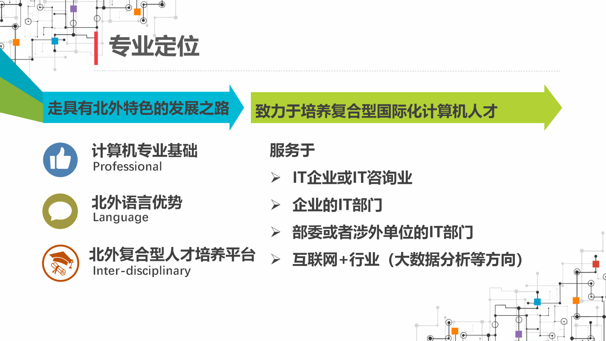 在建设与发展过程中,学院积极响应国家社会发展亟需,契合学校语言优势的整体学科特点,不断在培养复合型人才方面积极探索。学院致力于培养具有最强外语背景的计算机专业复合型人才,在培养过程中注重培养学生掌握扎实的计算机科学与技术专业基础,富有社会责任感、创新精神和实践能力,同时具有较高水平的外语语言基础和应用技能,能顺应信息技术和经济全球化的飞速发展,能把外语与计算机技术很好结合并应用于相关领域的国际化计算机专业复合型人才。